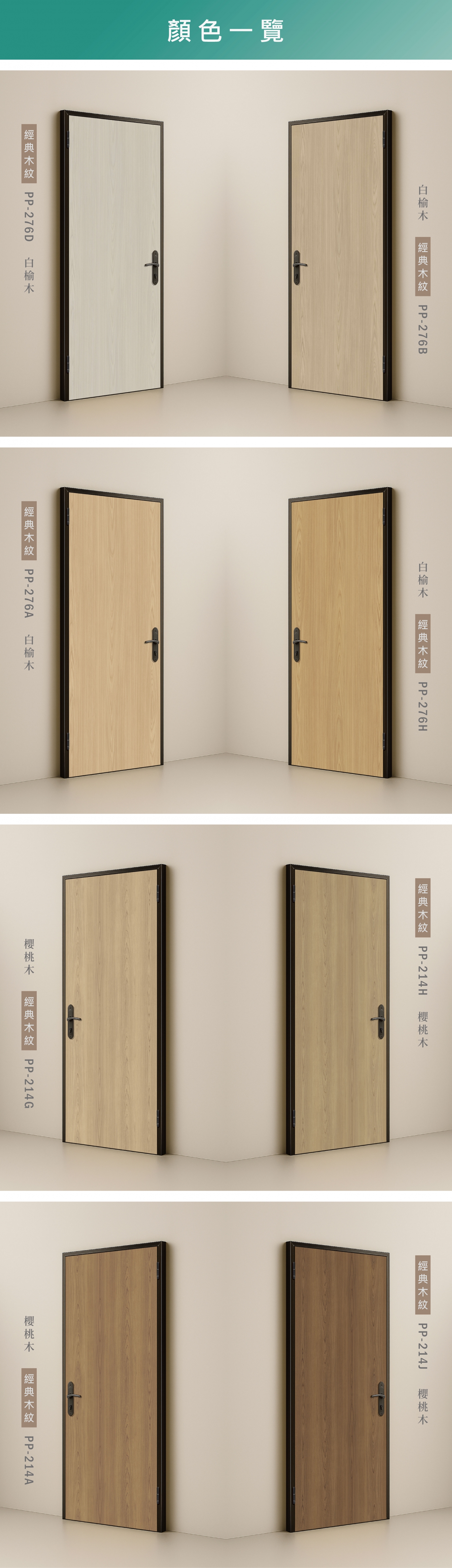 - F1等級低甲醛認證板材,讓住所更健康安全。提供上百款紋理與色彩選擇,能完美融入各種室內風格。適用於臥室房門、商空隔間門、民宿套房門等多元場域。