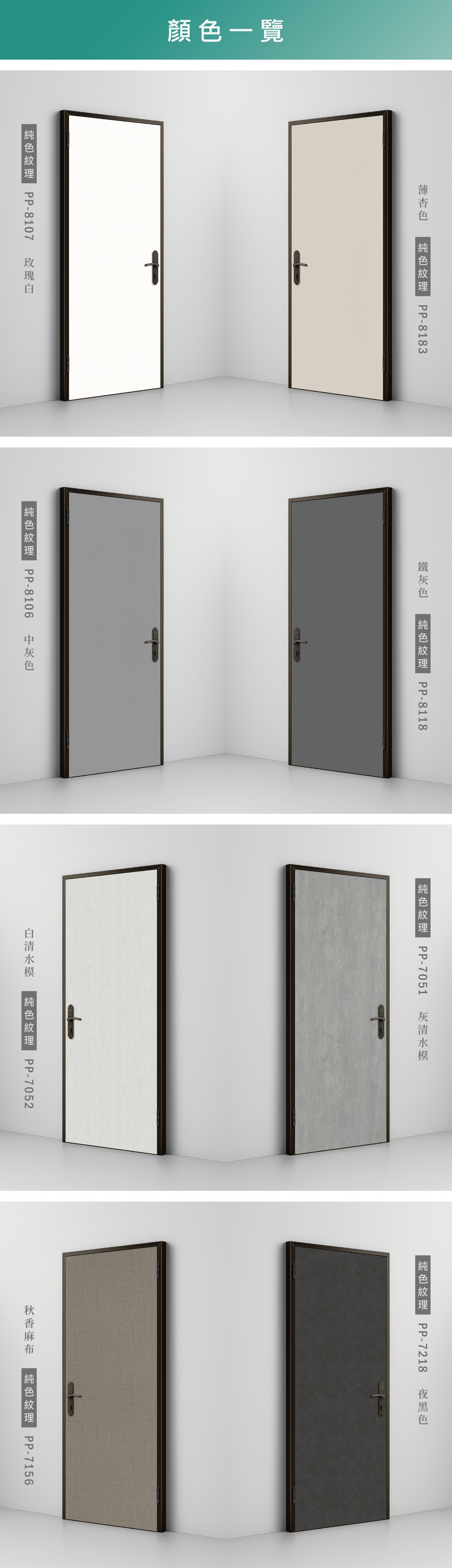 - F1等級低甲醛認證板材,讓住所更健康安全。提供上百款紋理與色彩選擇,能完美融入各種室內風格。適用於臥室房門、商空隔間門、民宿套房門等多元場域。