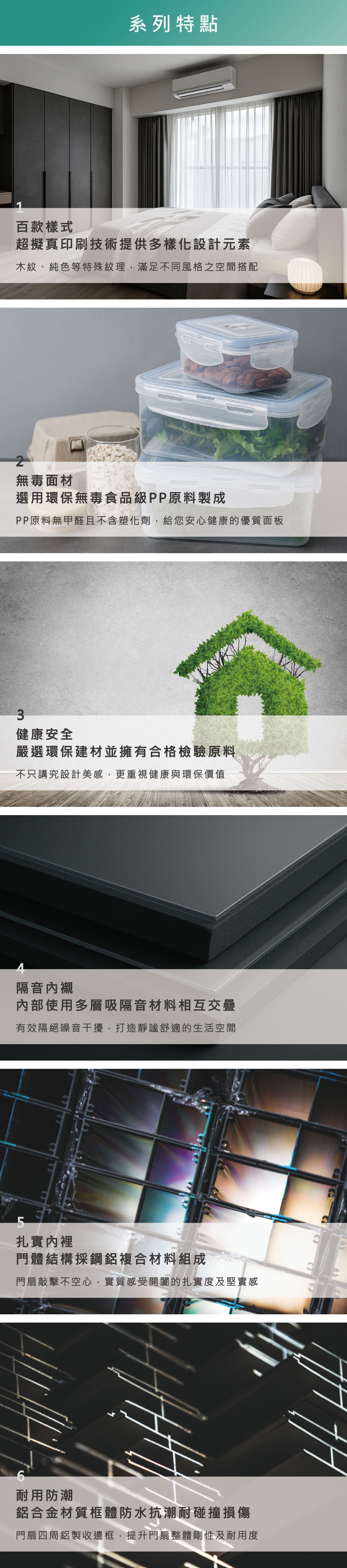 - 輕隔音x高扎實,採用隔音內襯搭配鋼鋁複合骨架,具備耐用穩定、不易變型等特性。食品級無甲醛表面材質,提供上百款紋理與色彩選擇,能完美融入各種室內風格。適合用於臥室房門、商業空間隔間門、民宿套房門等多元場域。